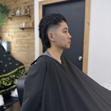 (Any desired cut and hot towel shave with black charcoal mask with nose and ear wax)